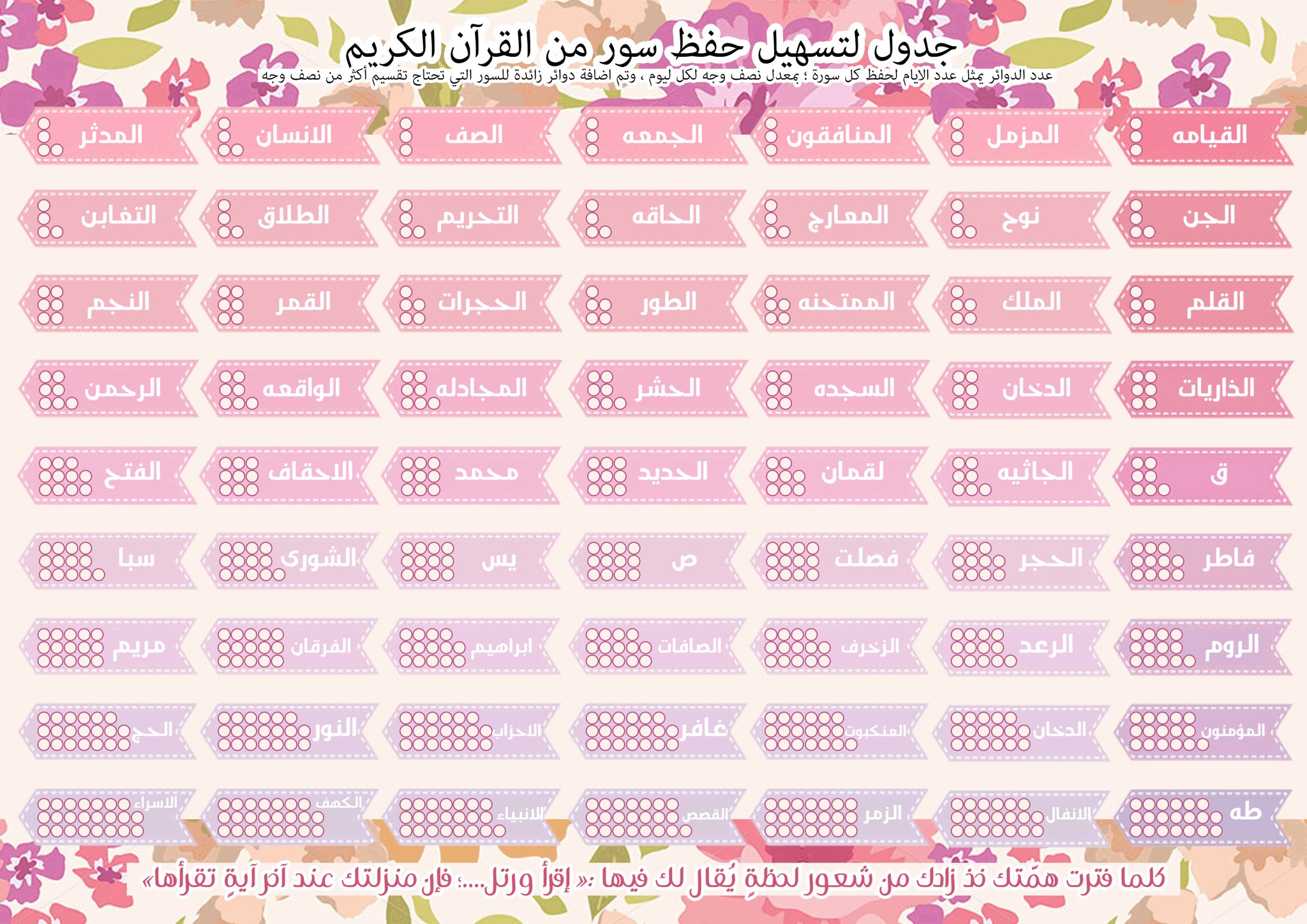جداول حفظ سور القرآن الكريم ساحة التسميع المنهجي أخوات طريق الإسلام