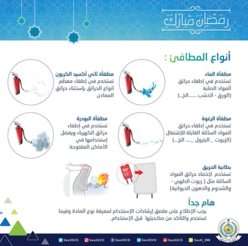 صحيفة عناية الصحية Ar Twitter الدفاع المدني أنواع المطافي المعتمدة مطفأة الماء إطفاء حرائق المواد الصلبة مطفأة ثاني أكسيد الكروبون معظم أنواع الحرائق مطفأة الرغوة إطفاء حرائق المواد