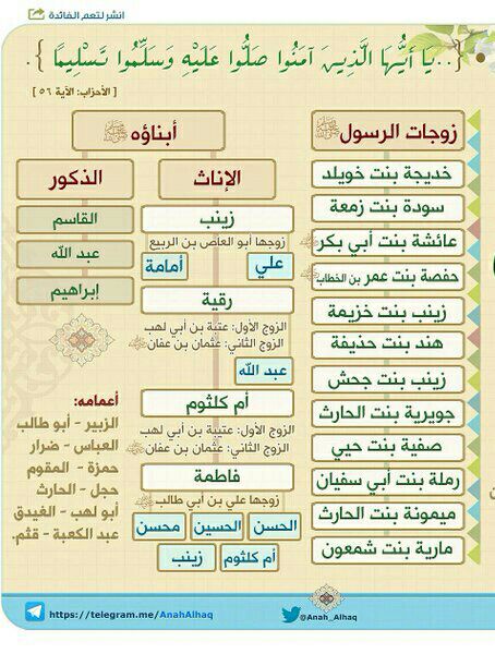 الثقافة العامة شجرة عائلة الرسول محمد ص زوجاته أولاده وبناته أحفاده