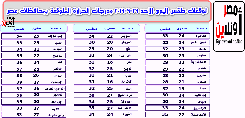 مصر اونلاين الاخبارية توقعات طقس اليوم الاحد 29 9 2019 ودرجات الحرارة المتوقعة بمحافظات مصر